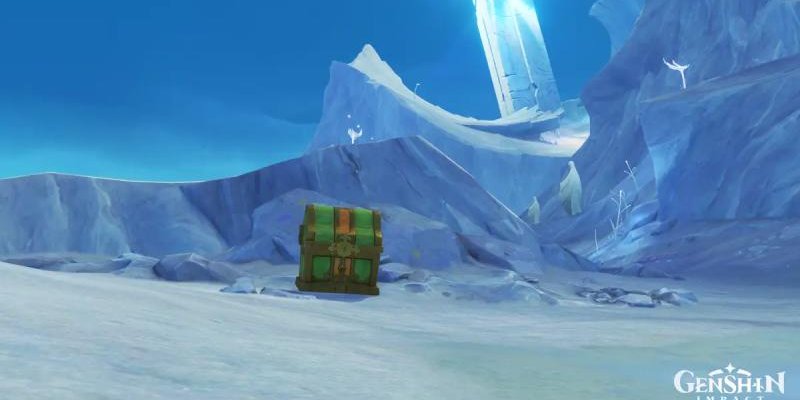 The next chest is located just north of the teleporter on the western shore of the Frostmoon Enclave. It is guarded by a pair of Cryo Hilichurls led by a Mitachurl.