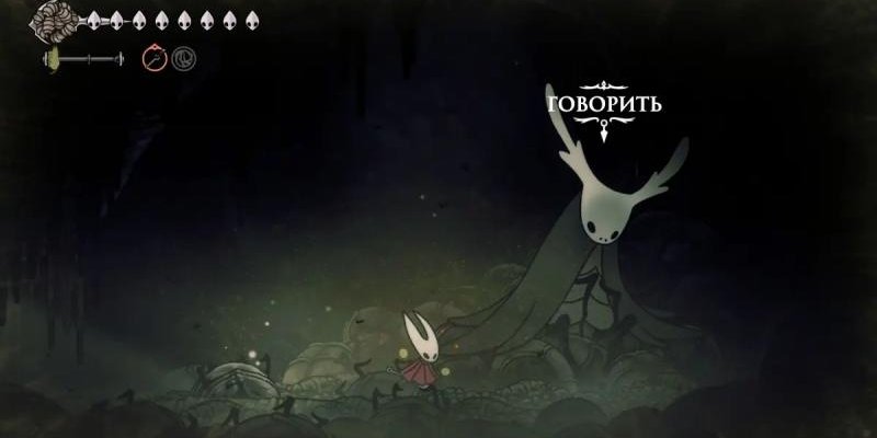 We go to the location through the elevator. We go out to the right to the mine and hit the lever to create a bridge. On the other side, go down and exit into the room with the altar, where you previously took the ability for Hornet.Â