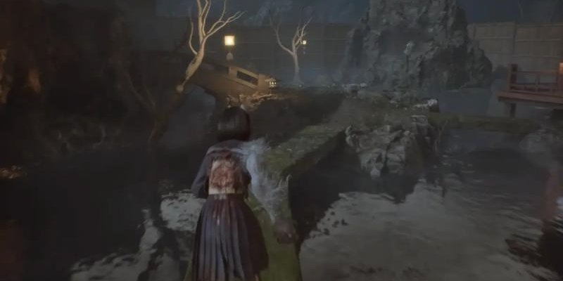 The path to “Crimson Water” opens only in NG+, in Chapter 9, when, when moving to another world, the game gives you the quest to chase the Fox Mask. Follow the stairs up to a room with a partially destroyed floor. On one of the walls you will see a bloody trail; you need to dispel the illusion and open the passage. Next there is a narrow corridor that ends at a locked door, behind which is hidden the Abode of Crimson Water.
